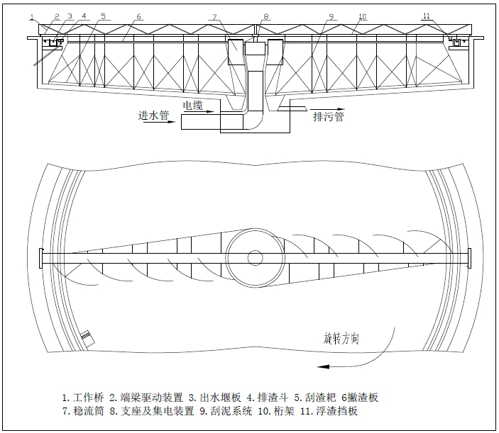 原水從池底經(jīng)中心支墩上不流出,并經(jīng)穩(wěn)流筒配水后,呈輻射狀流向池子周邊集水槽出水,隨著輻向流速的降低,原水中的懸浮物被分離而沉降于池底。工作橋以中心支座為圓心,帶動刮泥、排渣機構(gòu),在驅(qū)動裝置驅(qū)動下將污泥刮集至沉淀池中心集泥槽,依靠水壓或泵排出池外,上部浮渣由刮渣板同步刮至排渣斗排出。